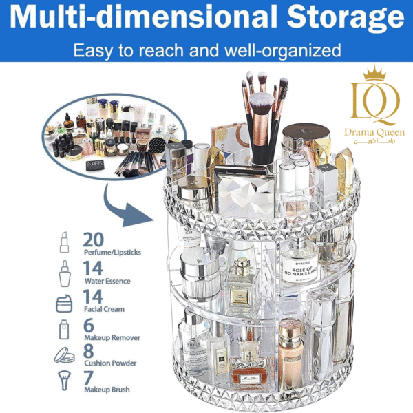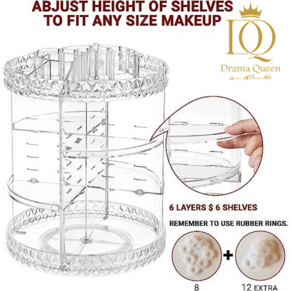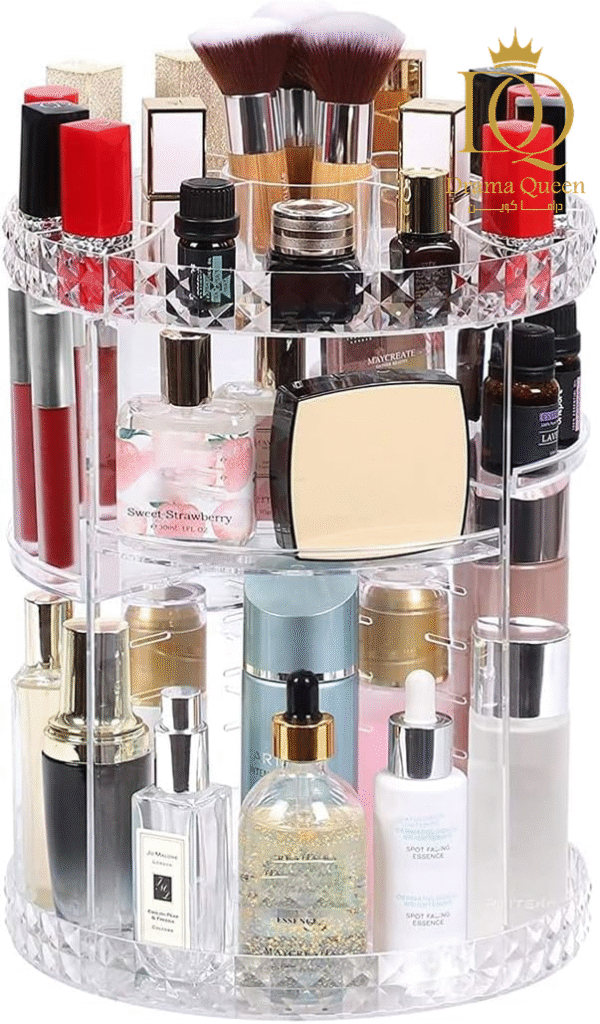 رتبي مكياجك بكل أناقة وتنظيم مع منظم المكياج والإكسسوارات الشفاف. مع تصميمه العصري الذي يدور 360 درجة، ستتمكنين من الوصول إلى جميع مستحضراتك بسرعة وسهولة.